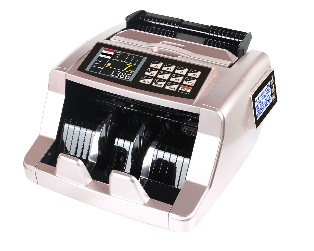• بتكشف تزوير بنسبة 100% لانها تحتوي علي أحدث تقنيات الكشف الرباعي (الأشعة فوق البنفسجية,الحبر المغناطيسي,السمك وخام الورق,الأشعة تحت الحمراء).